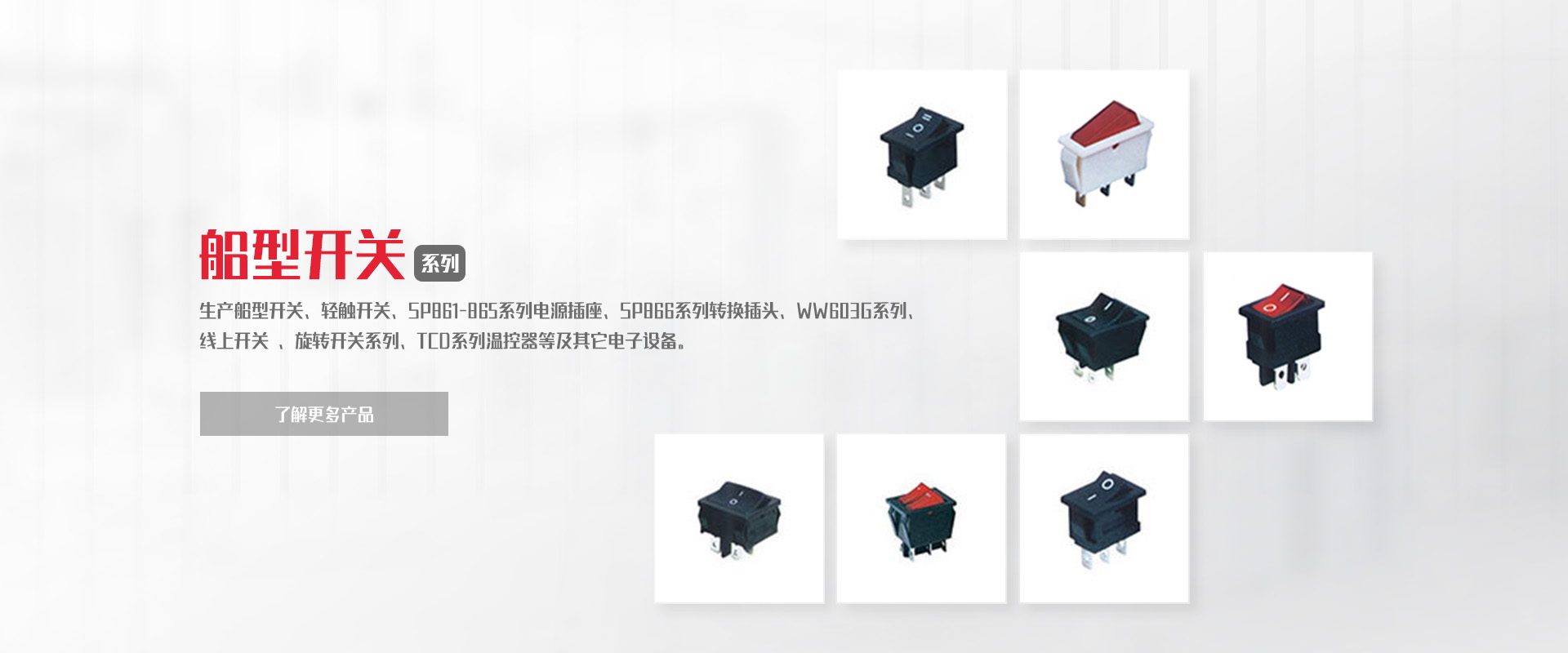 公司專業(yè)生產(chǎn)船型開關(guān)、輕觸開關(guān)、SP861-865系列電源插座、SP866系列轉(zhuǎn)換插頭、WW11系列微動(dòng)開關(guān)、WW01-03、09系列按鈕開關(guān)DS、WW系列指示燈開關(guān)、WW603G系列 線上開關(guān) 、旋轉(zhuǎn)開關(guān)系列、TCD系列溫控器等及其它電子設(shè)備。